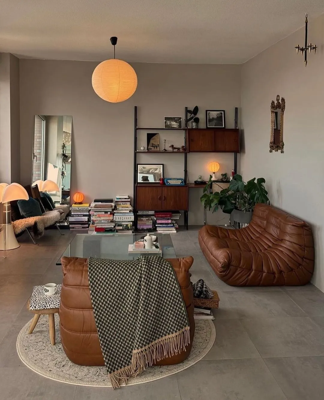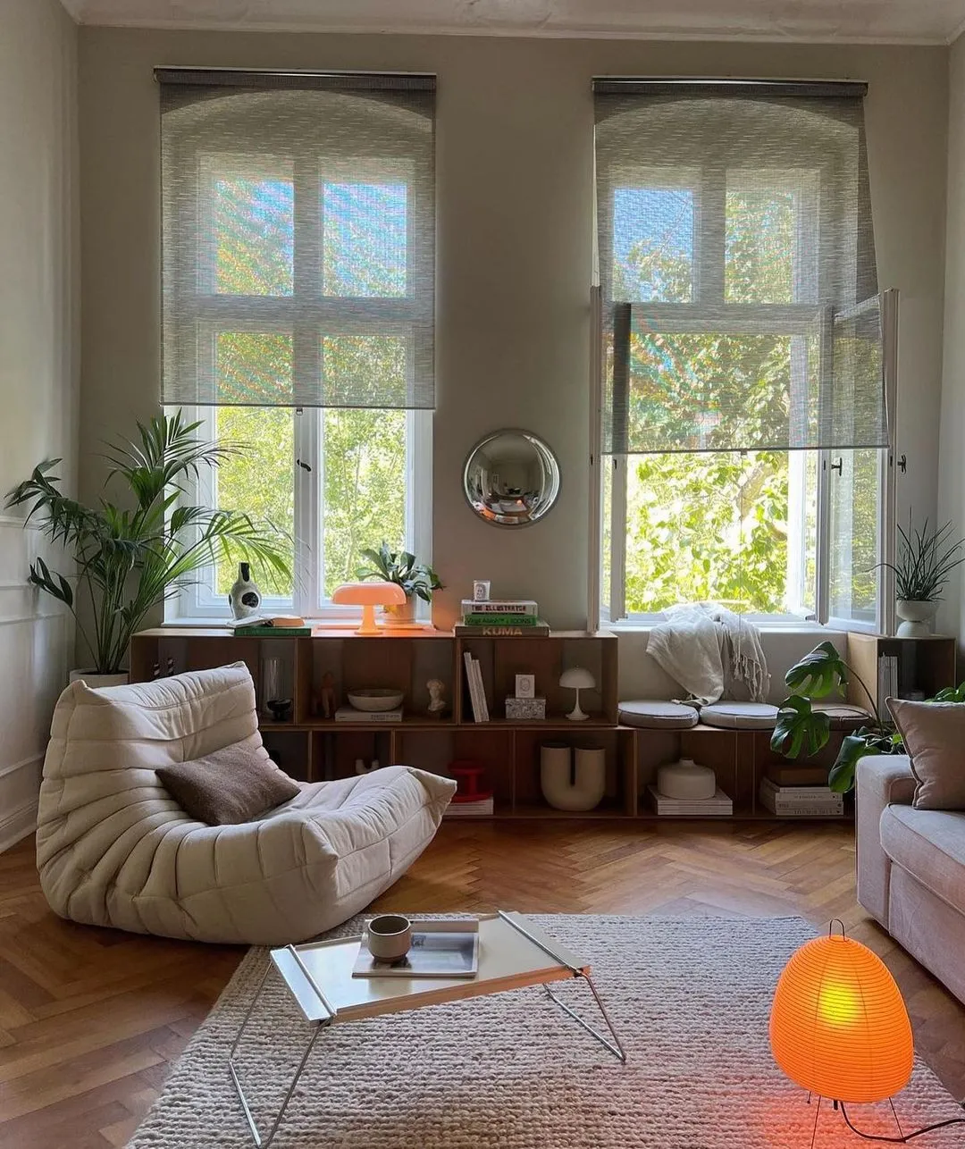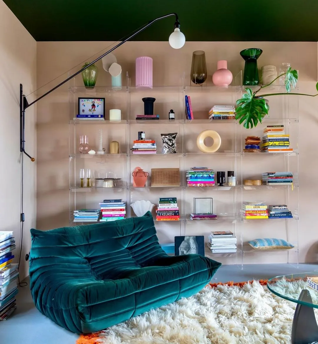 Los objetos decorativos como lámparas de lava, espejos con formas abstractas, y jarrones de cerámica coloridos son ideales para añadir un toque retro. Además, las plantas de interior, especialmente las de gran tamaño, completan esta estética, aportando un aire fresco y natural.